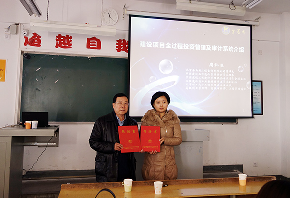2014年12月16日上午,我公司董事长周和生先生向内蒙古建筑职业技术学院工程管理学院捐赠“建设项目全过程投资管理及审计系统”软件,并向学院师生们讲授“建设项目投资管理及审计信息化”课程,大力支持学校教学工作。