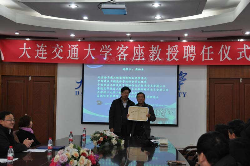 2013年1月9日,应大连交通大学邀请,我公司董事长周和生先生受聘为大连交通大学工程管理类学科客座教授,颁发客座教授聘书。