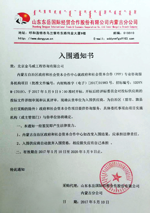 2017年5月10日,内蒙古自治区政府和社会资本合作中心就政府和社会资本合作(PPP)专业咨询服务机构项目,开标后经评标委员会对投标供应商的投标文件详细审阅和认真评审,确认我公司入围“内蒙古自治区政府和社会资本合作专业咨询服务机构项目”(招标编号:SDDYNM-17019)。