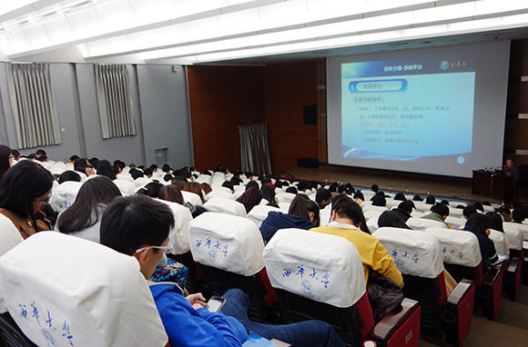 仪式结束后,周和生董事长为建筑与土木工程学院学生及相关部门工作人员作了题为“建设项目全过程投资管理及审计系统介绍”的学术报告。